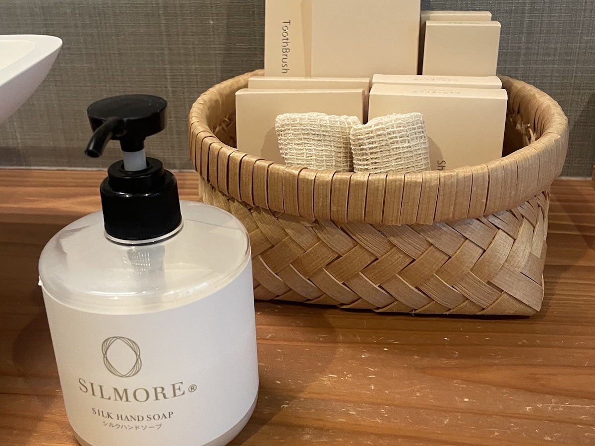 ハンドソープやボディーローション、シャンプーやコンディショナーなどは、純国産天然シルク由来のスキンケア「SILMORE」シリーズが用意されています。