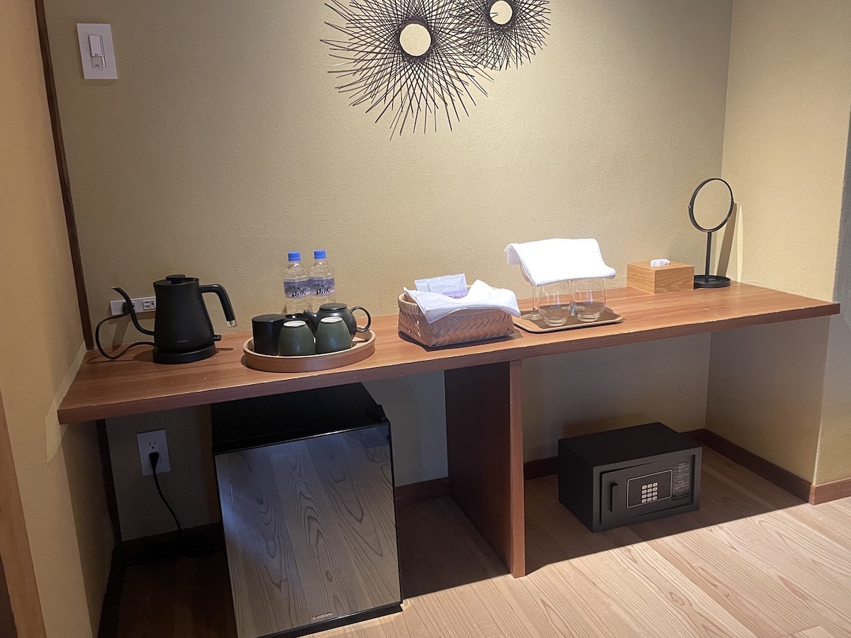 客室のかたわらには、冷蔵庫や金庫、カップやグラス、電気ポットなどが用意されています。