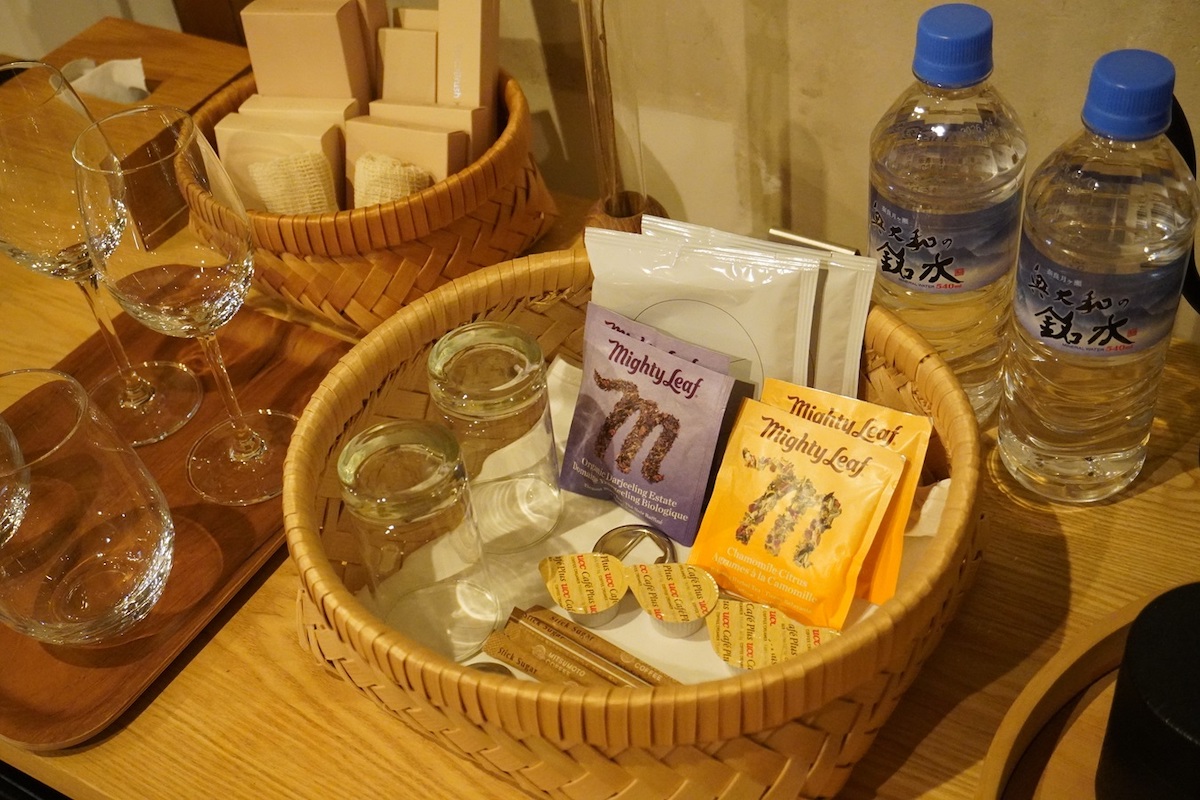 ウェルカムドリンクは、大和ほうじ茶と甘酒。フロント前のソファに座っていただきます。香り高い大和ほうじ茶と、飲む点滴ともいわれる栄養たっぷりの甘酒に、思わずほっこり。「奈良と日本酒を楽しみ、その魅力を発見する宿」というコンセプトを、チェックインと同時に感じられる心遣いです。