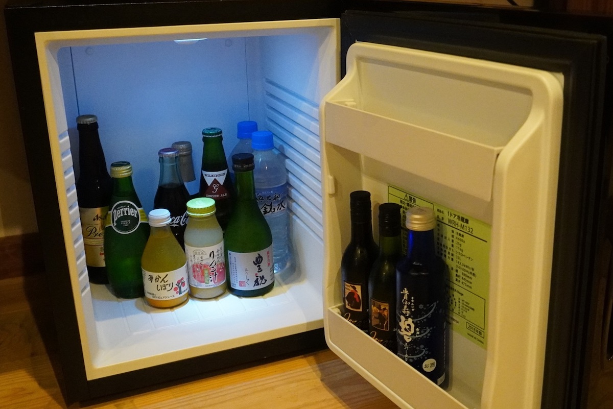 冷蔵庫には、さまざまな種類のドリンクが用意されています。なんと、冷蔵庫のドリンクはすべて無料! ビールやソフトドリンク、もちろん豊澤酒造の日本酒も入っています。