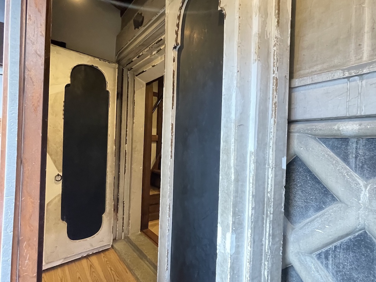 くつを脱いで中に入ると、さらに重厚な漆喰の扉が待ち構えていて、「うわー」っと思わず声をあげてしまいます。扉を開けると蔵がある!という衝撃。蔵の外観をそのまま建物の中に閉じ込めたような、おもしろい造りに感動します。大事にされてきた蔵をそのまま生かしているところが素敵です。