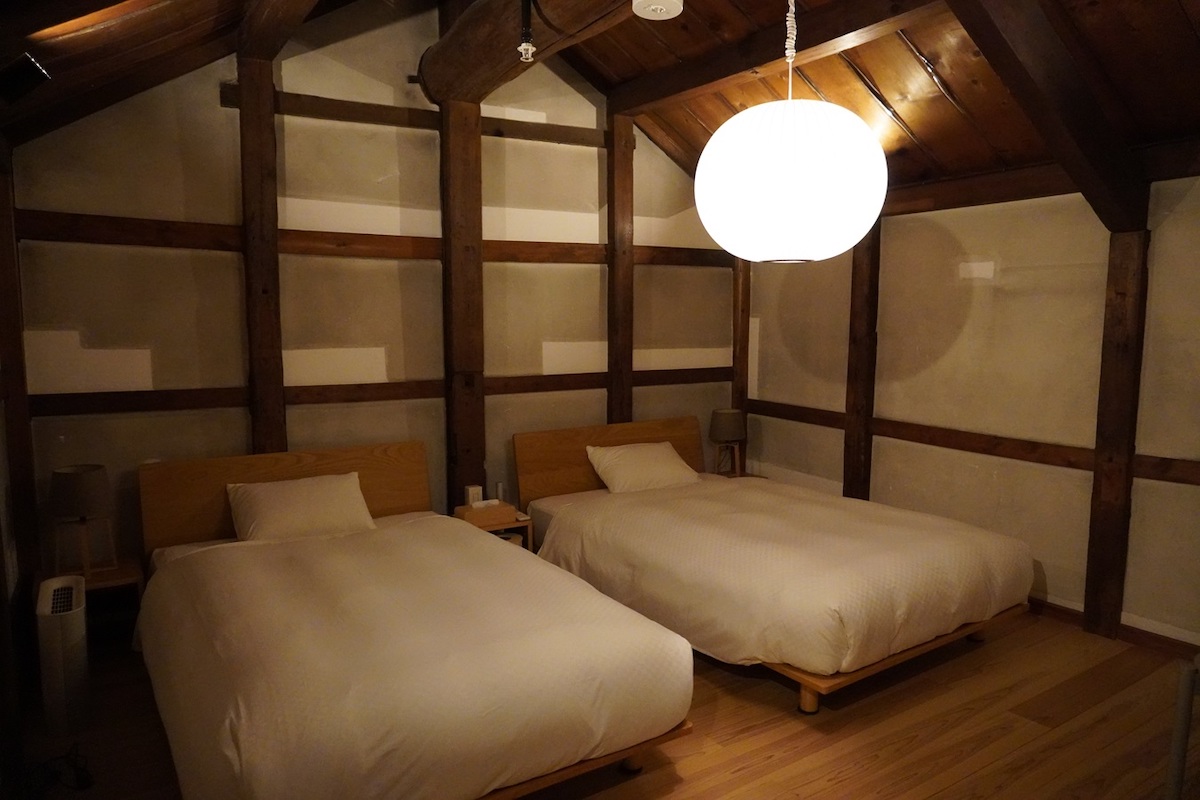 「105 KANOE」は、もともと米蔵として使われていた建物で、ベッドルームは高い天井が特長的。格子戸から明るい光が差し込む、開放的な雰囲気が素敵です。窓の外には、緑や周囲の瓦屋根が広がっていて、見晴らしも最高。床がじゅうたん敷きで、歩きやすい和モダンなスタイルも人気だそうです。