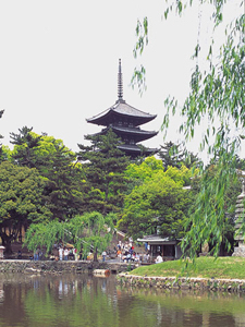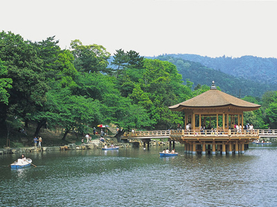 奈良公園内にある池で奈良八景のひとつとなっています。池の周囲の柳と興福寺五重塔が水面に映り込む風景は美しく、人気の記念撮影スポットです。
