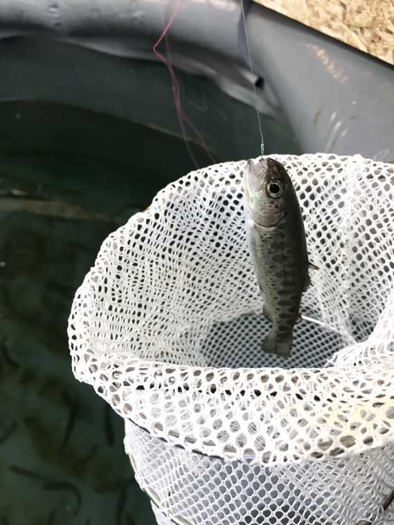 でも、このとき水槽に入っていたニジマスの稚魚はとっても食欲旺盛!針を入れた瞬間、微かに喰いついた感触が!すかさず引き上げるも既にエサは食べられた後…。店員さんいわく、「エサをつついた瞬間が引き上げるタイミング」とのこと。何回かエサを食べられてからコツをつかみ、開始数分で念願の一匹目を釣り上げました!