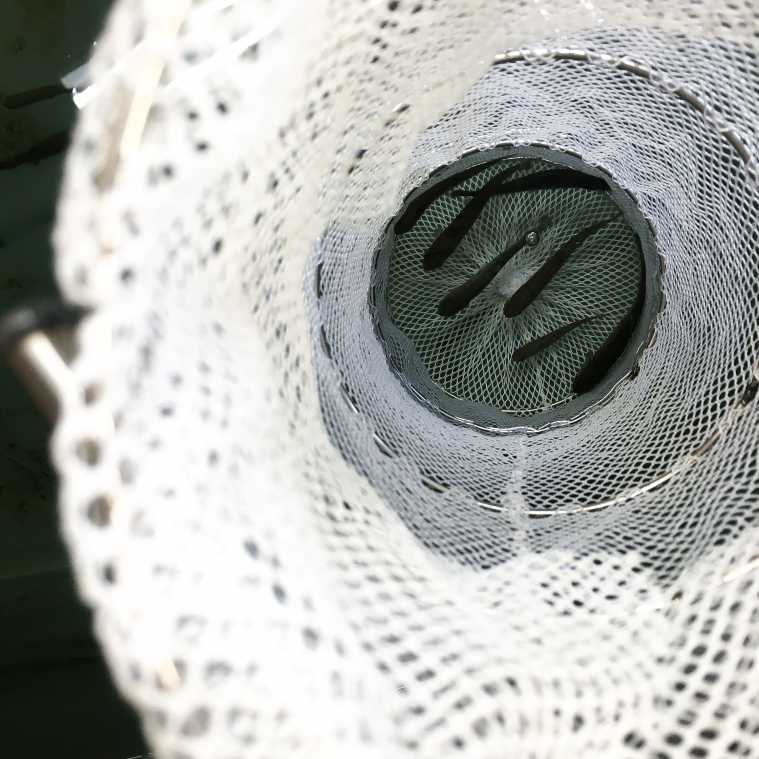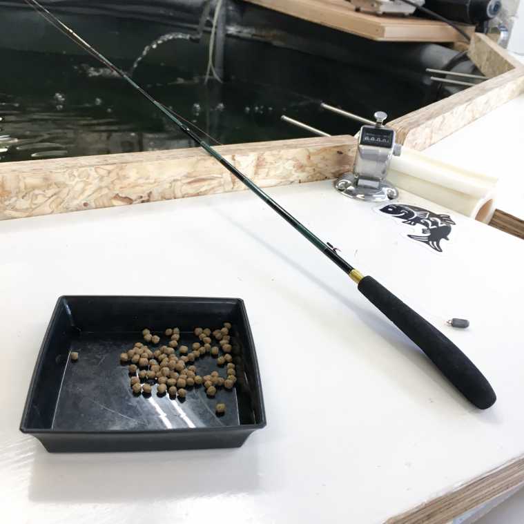 コロンとした小さなエサをかえしの無い釣り針に装着し、優しく水槽に投げ入れます。アタリが全然来ない釣りを経験したことがあるので、「本当に釣れるのかしら…?」と疑心暗鬼でした。
