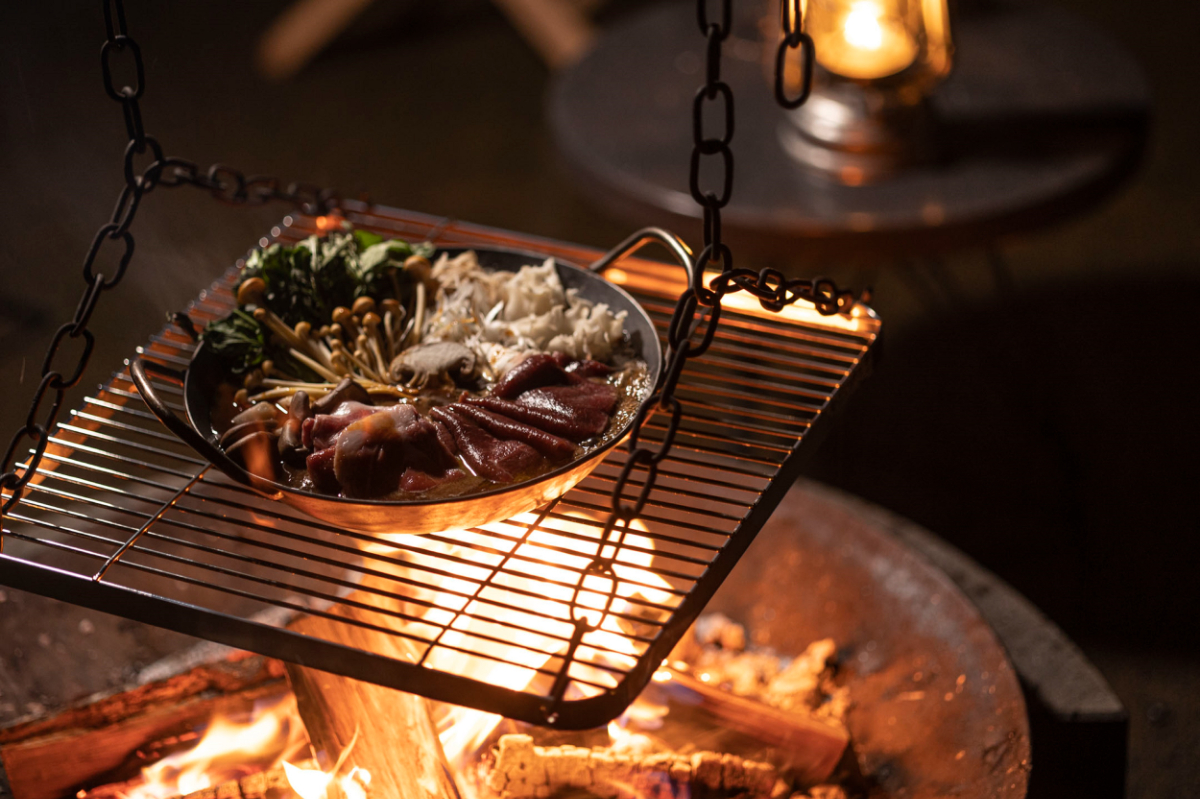 アカマツの森に囲まれたフォレストキッチンで、秋から冬にかけて狩猟が最盛期を迎える、滋味深いジビエを使ったディナーが味わえます。冬時期のシカは、木の実や落ち葉などを食べるので、赤身と脂身のバランスが取れていてクセも少なくうま味が増しているのが特徴なのだとか。ジビエディナーはグランピングマスターと一緒に仕上げて味わえます。