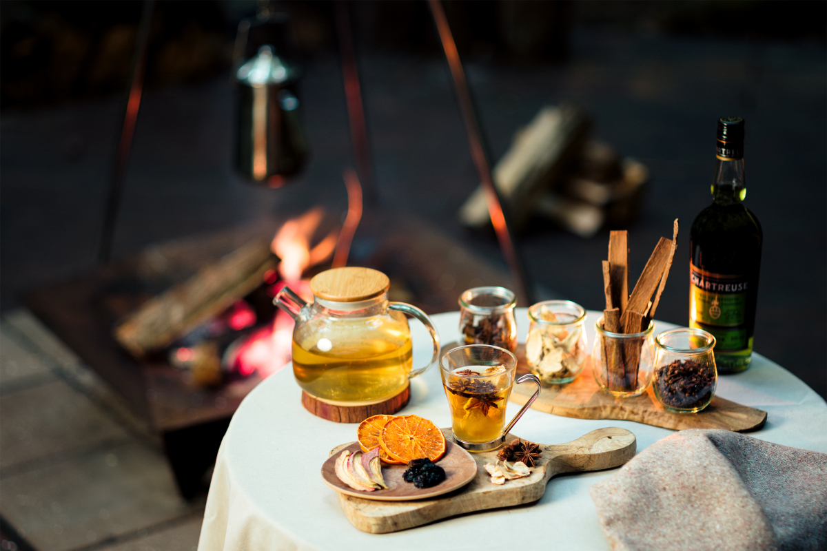 焚き火を使ってハーブティーを作り、お好みでスパイスやドライフルーツ、薬草のリキュールを組み合わせて、オリジナルの薬草酒を楽しむことができます。