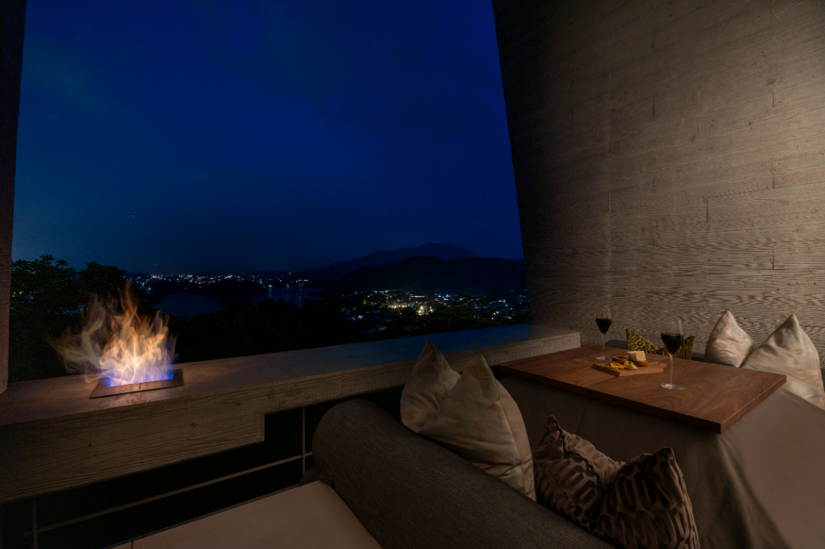 キャビンとよばれる「星のや富士」の客室。広々したテラス付きで設えたソファに座って絶景を楽しむことができます。