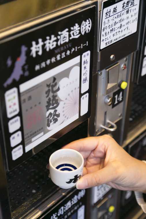 飲みたい日本酒が決まったら、コインを投入。横にある黄色いボタンをポチッと押すと、おちょこにお酒が注がれる仕組みです。
