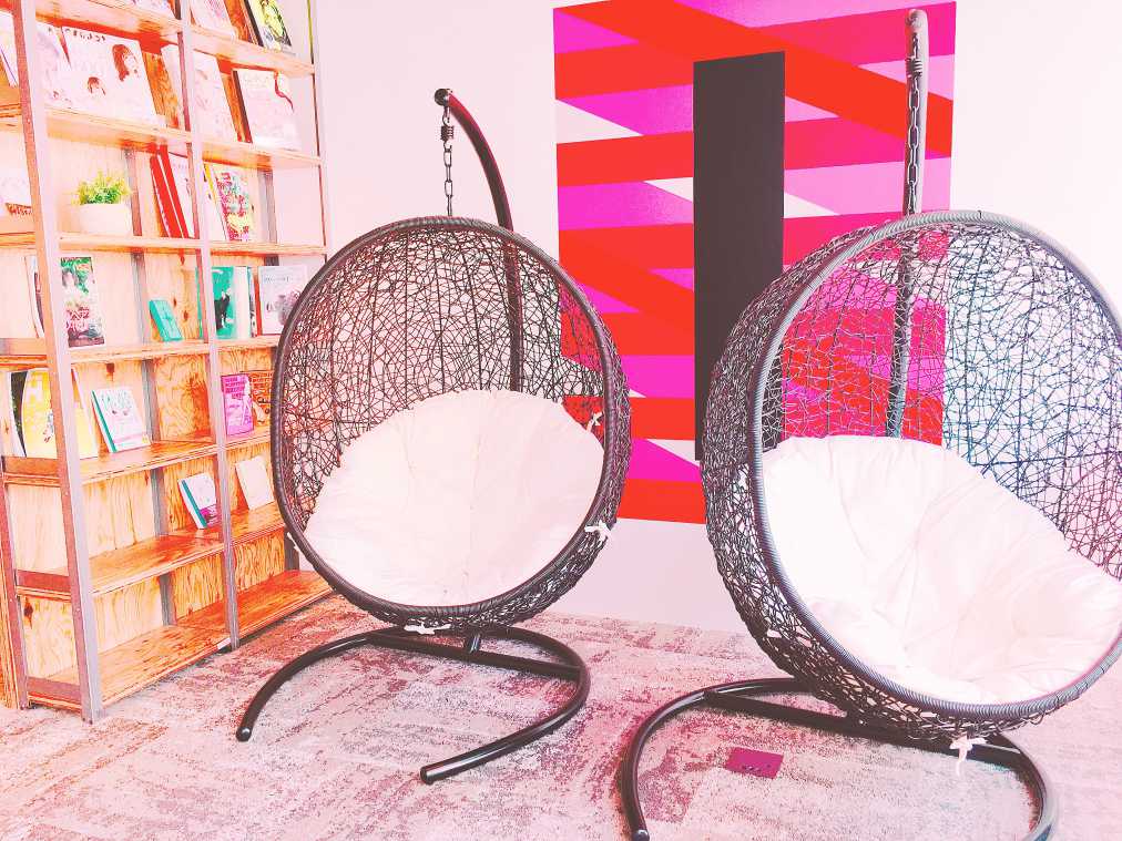 これは6F女性専用フロアの繭型ハンギングチェアです。心地よい揺れがリラックス効果を高めてくれるので、雑誌をパラパラめくりながら体をあずけているとステキなアイディアが浮かんでくるかも!?