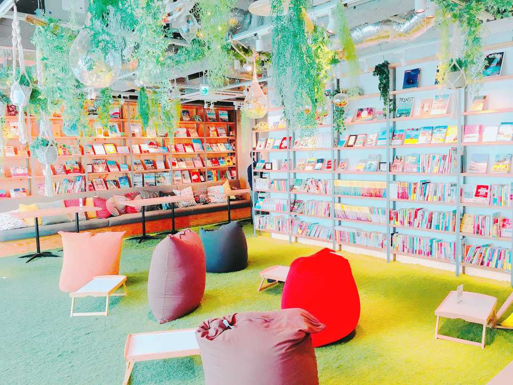 ここ5Fはグランピングをイメージしたフロア。旅や自然をテーマにセレクトされた本と緑に囲まれて、“人をダメにするクッション”こと「Yogibo」のビーズクッションに体をうずめれば3秒でくつろぎ体制完了!