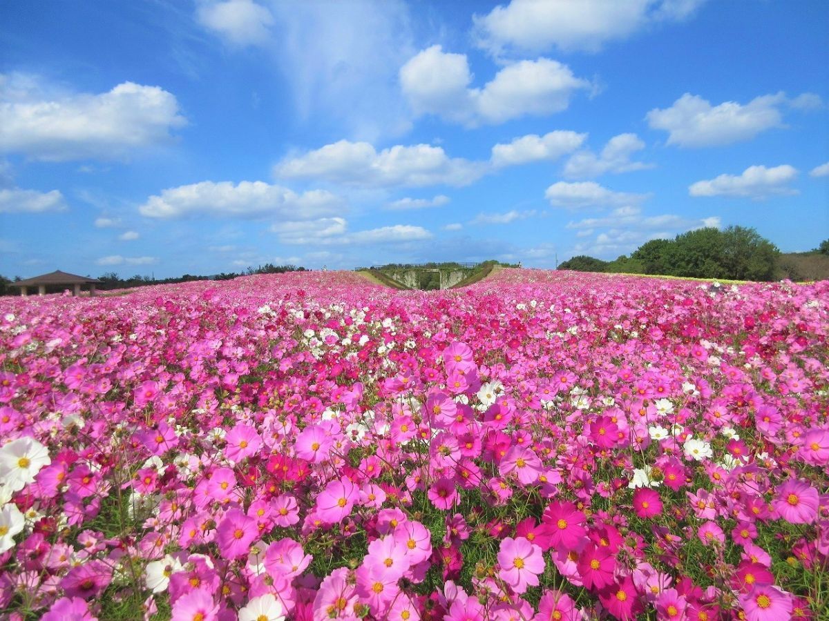 一面に広がる花の絶景が楽しめることでも人気の「国営海の中道海浜公園」では、10月中~下旬にコスモスが見ごろを迎えます。100万本のコスモスが丘一面をピンクに染める光景は見事! ほかにも春の桜に始まり、チューリップ、ネモフィラ、バラ、コスモス、コキアと、一年を通して四季折々の花を楽しむことが出来ますよ。