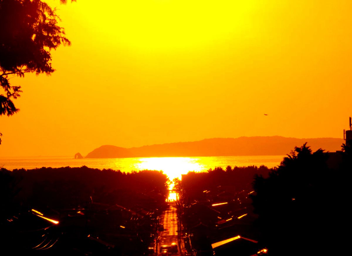 参道の先には砂浜と海が広がる絶景が。毎年2月と10月のごく短い期間にだけ、沈む夕陽が参道を照らし、まばゆく神々しい「光の道」が開けます。黄金色とも朱色ともつかない、絶妙な色彩の夕景と、まっすぐに光が伸びる様子はまさに絶景のひとこと。折しも次のチャンスは10月20日前後。見逃す手はないですよね。