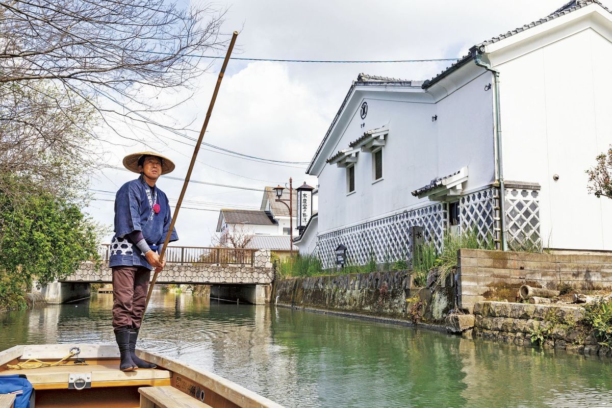 柳川の名物は、街の水路をどんこ舟で行く「川下り」。街なかを走る、江戸時代の掘割(地面を掘って水を通した所)を巡る約70分の舟旅です。