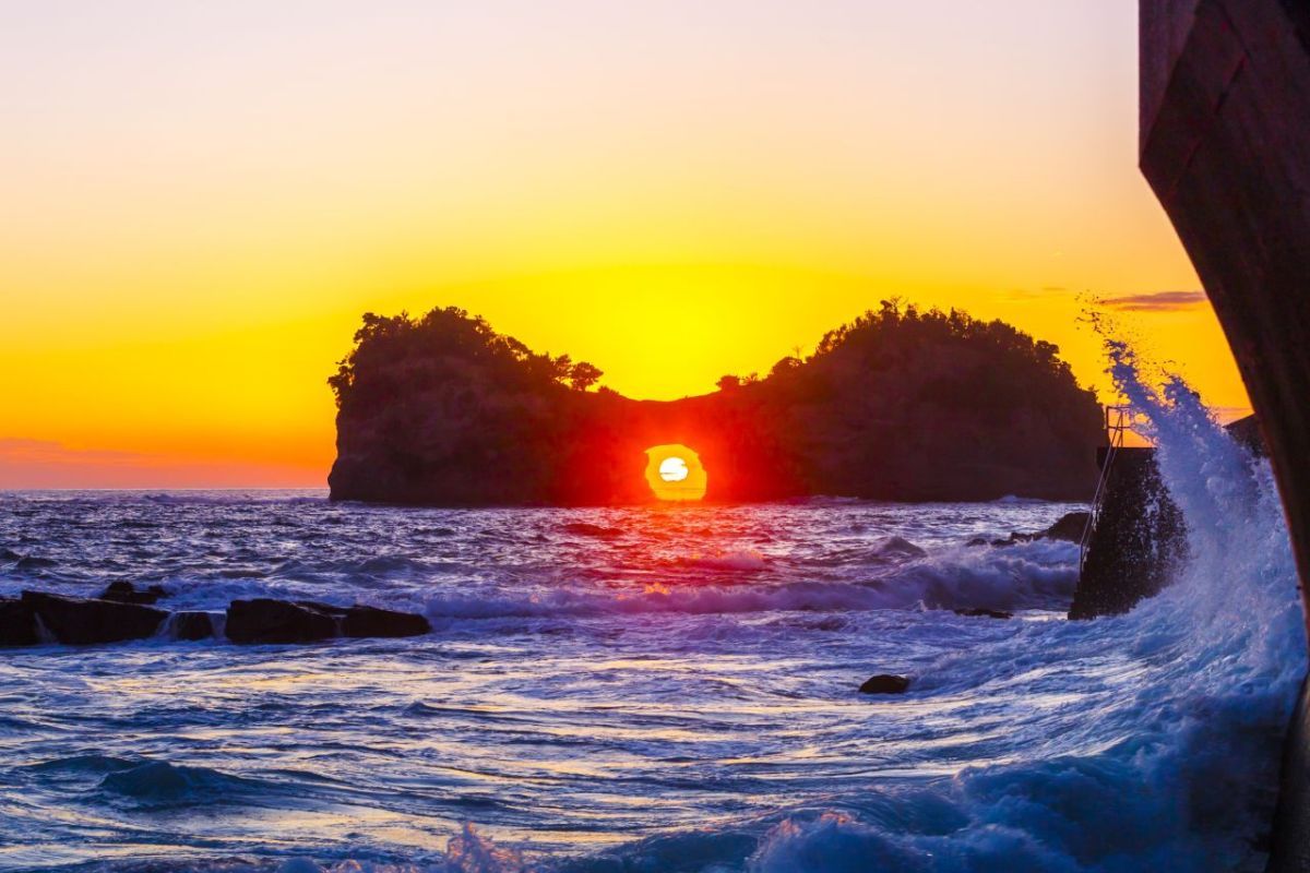 臨海浦に浮かぶ南北130m、高さ25mの無人島「円月島(えんげつとう)」。正式名は「高嶋」ですが、中央に海食洞の丸い穴が空いているので「円月島」とよばれるように。夕焼け時は特に美しく、春分・秋分の日の前後には夕日が穴に収まる絶景が見られます。