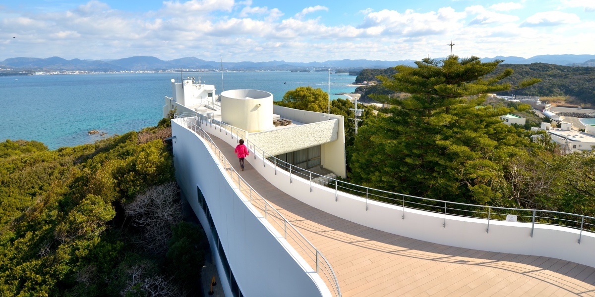 熊楠が研究した変形菌・粘菌をイメージさせる曲線を活かしたユニークな形の建物が自然の中に溶け込んでいて、屋上からは360度の大パノラマの絶景を望むことができます。
