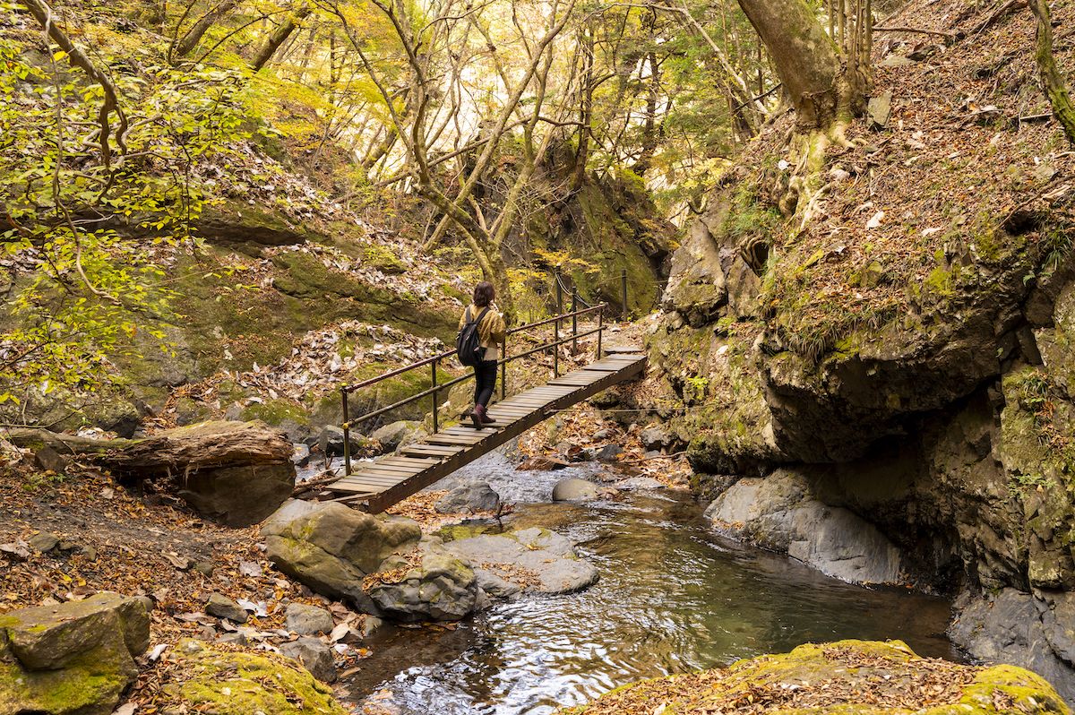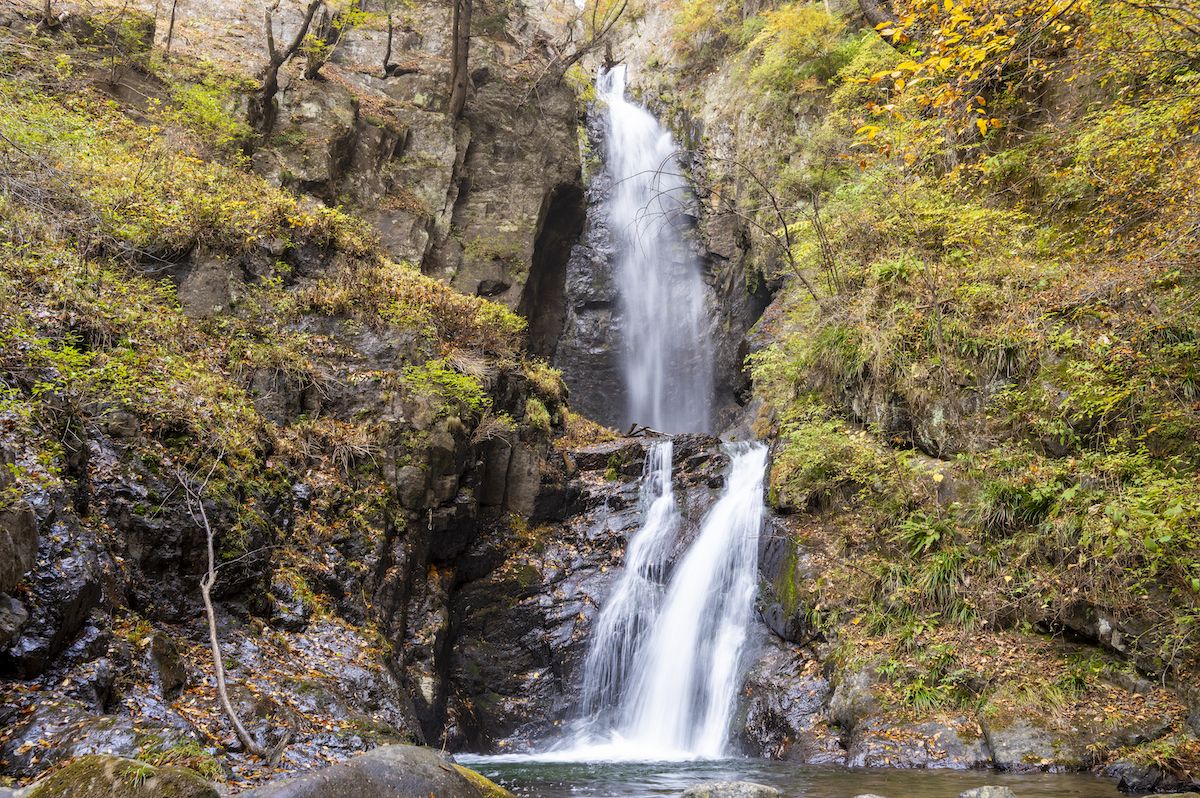 歩き始めてから15分ほどで、終着地点である板敷大滝に到着。高さ30mの場所から水がとめどなく流れ、清らかで神秘的な滝壺が形成されています。水のパワーを感じながら鳥のさえずりやせせらぎに耳を傾けるうち、日常を忘れ、心がみるみる洗われていくはず。ちなみに板敷渓谷・大滝は、この地域のパワースポットとしても有名です。