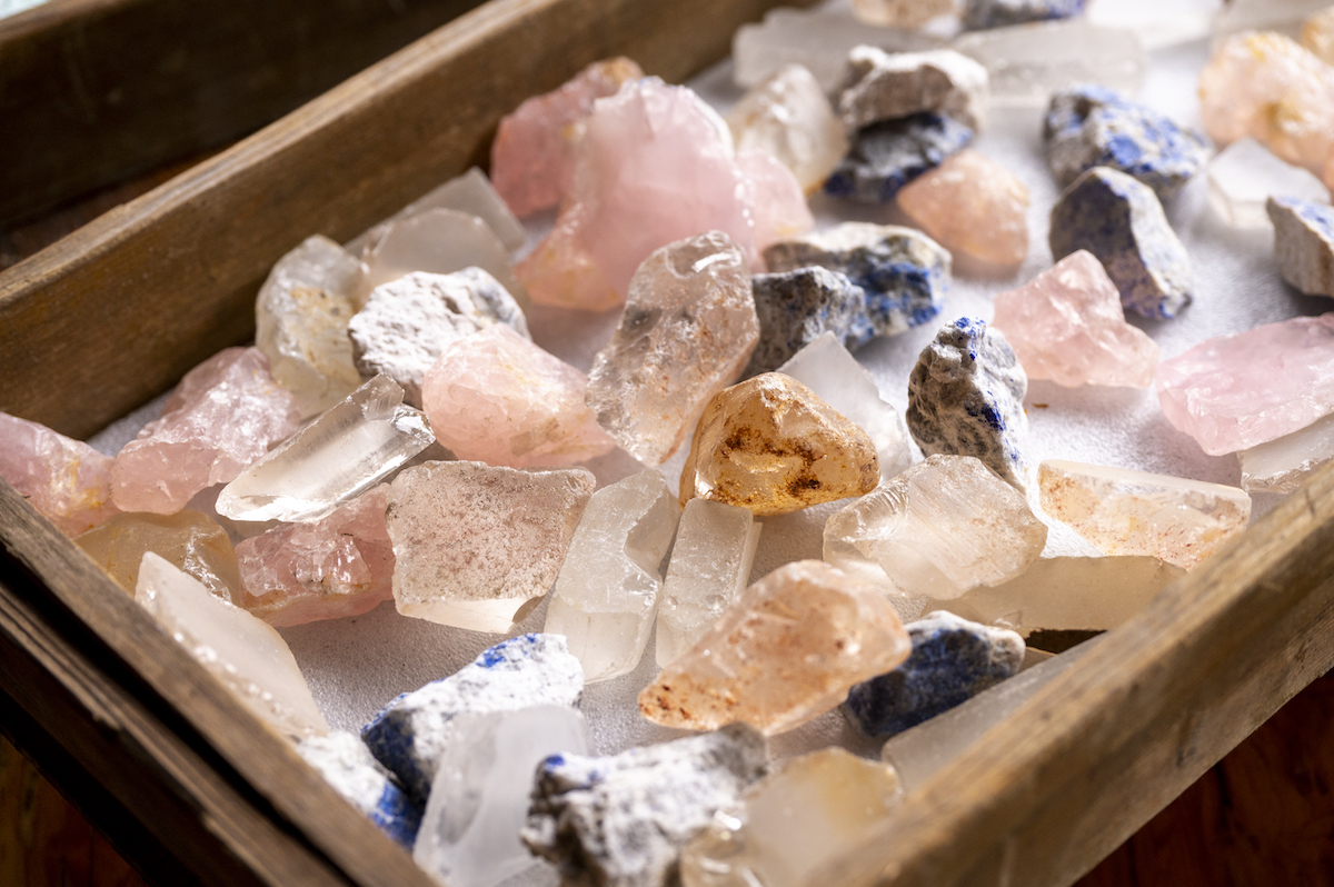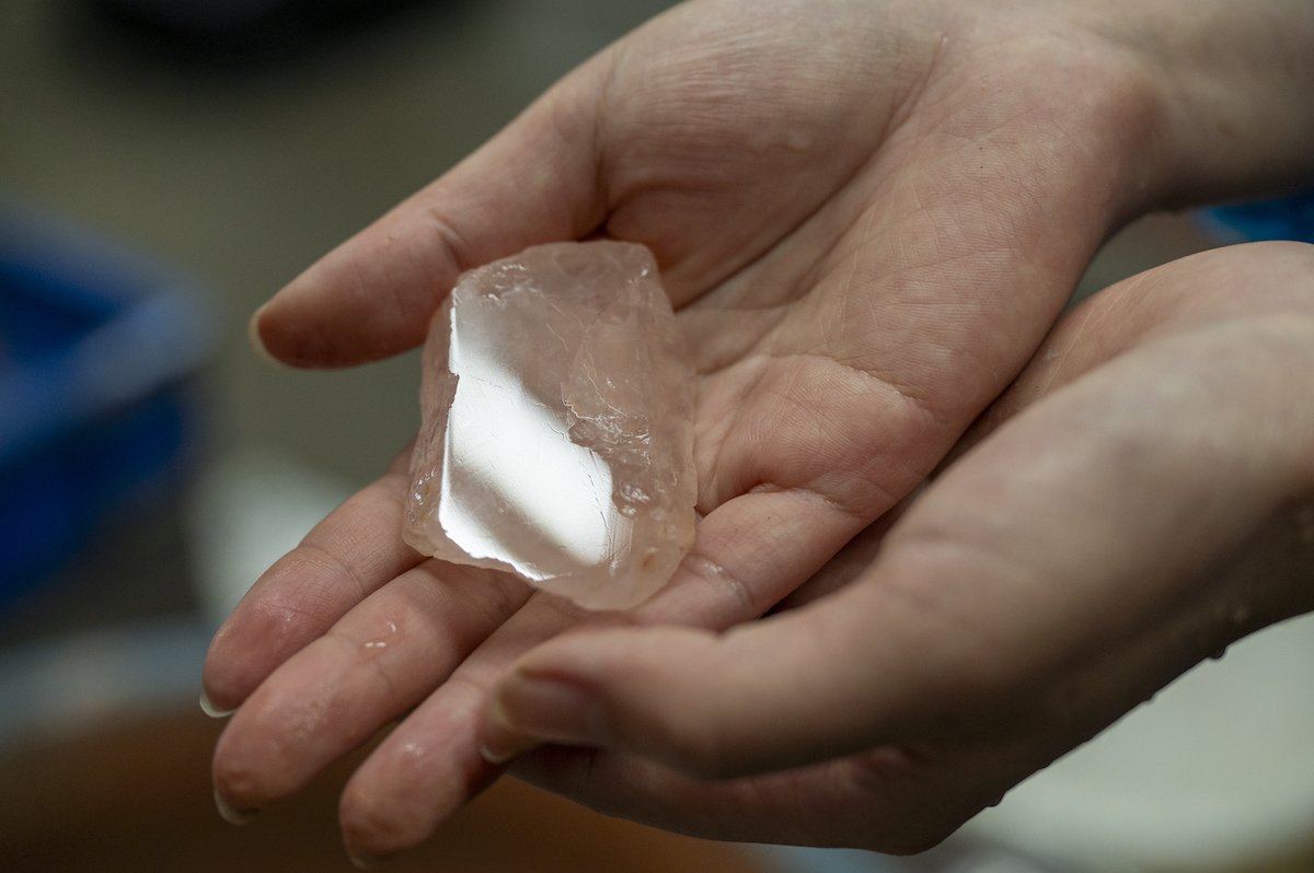 研磨体験では最初に、複数種の水晶のなかから自分の好きなものを選びます。取材時は、淡いピンク色が持ち味のローズクオーツをセレクト。この時点ではまだ研磨されていないため、やや濁ったような色合いです。ここから専用の機械と研磨剤を使って磨くことで、つややかな表情が現れるのだとか。