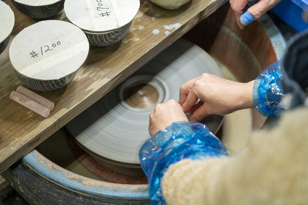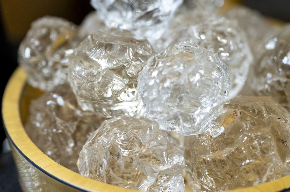 採掘されたばかりの水晶は、あちこちに凹凸があり、全体がくもった状態。この水晶の原石を、「たがね」という細長い金属を使って荒削りしていくところから、水晶の加工は始まるのだそう。なお、水晶を荒削りする作業は「かっこみ」とよばれています。かっこみは水晶の形や特徴を生かして行う必要のある非常に難易度の高い作業なのだそう。かっこみを経た水晶は、小さな円盤が設置された機械で少しずつ磨かれていきます。
