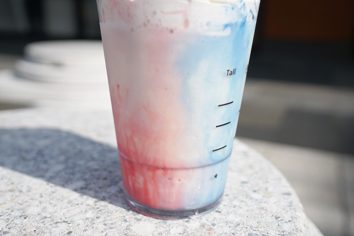 …青と赤の正体は? ブルーベリー風味のブルーハロウィンパウダー、ラズベリー風味のレッドハロウィンパウダー。一杯ごとにバリスタが魔法をかけるように、異なる模様を描いてくれます。今回は、青白赤のトリコロールのよう。ほんと、魔法みたいなビジュアルが魅力的♪