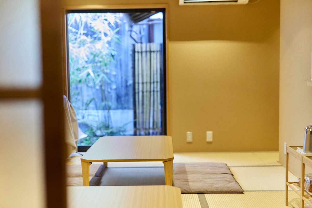 もうひとつの部屋は坪庭を望む和室。坪庭は、奥行きが長い「うなぎの寝床」とよばれる京町家に日の光を入れ、風通しをよくするために設けられた空間。