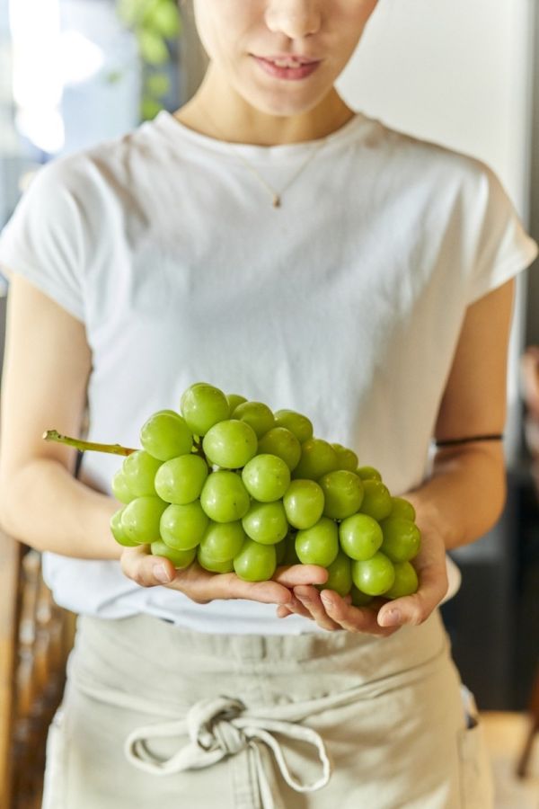 「cafe hello ioa」で使われているシャインマスカットの大きさをお伝えしたくて、店主さんに持ってもらいました。店主さんが華奢なのもあるのですが、1房でこのボリューム、そして1粒の大きさにも注目してください! 高級フルーツのなかでも最高級レベルです。