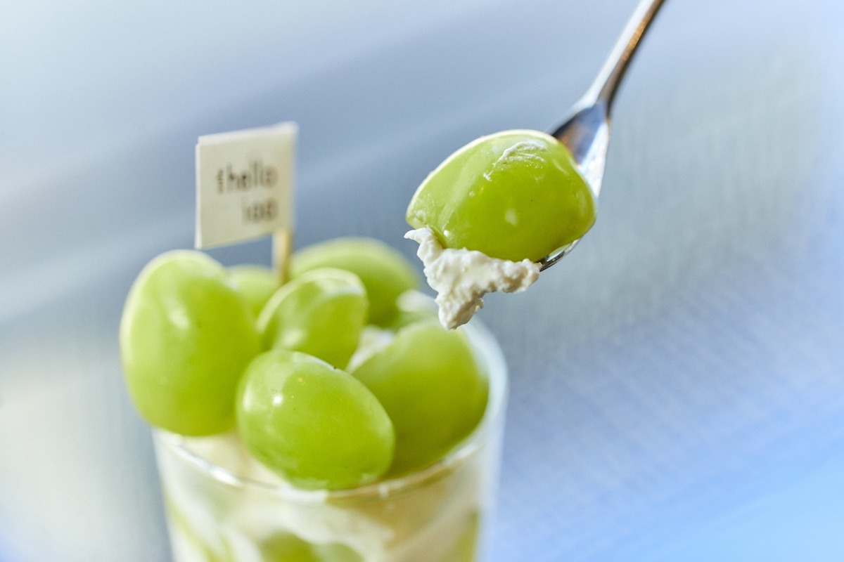 つやつやとしたシャインマスカット。皮は限りなく薄く、ぷちっと噛んだときに広がるみずみずしさがたまりません。マスカルポーネチーズのクリームやレモンのソルベなど酸味のある素材との組み合わせで、キレのよい甘さがすばらしいです。
