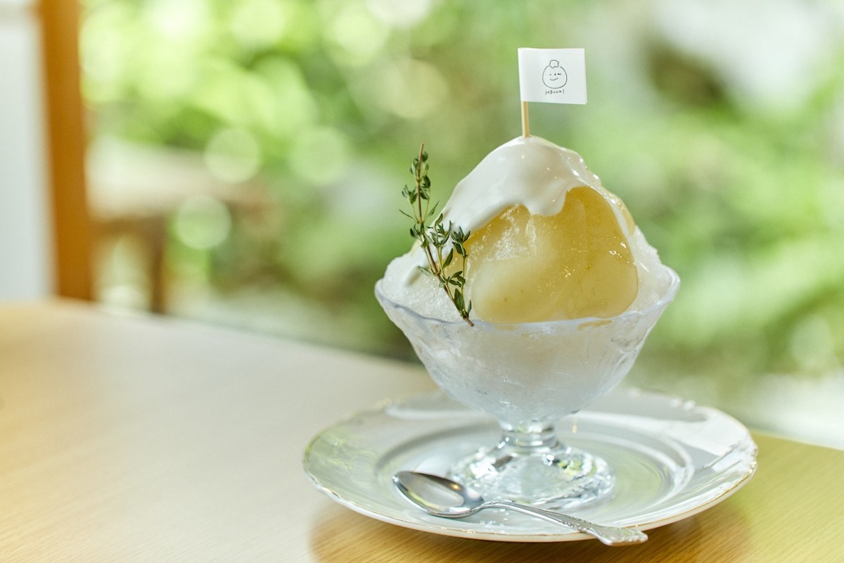 「和梨のかき氷」で使う梨は主に豊水と幸水。種類はもちろん個体ごとにも糖度や水分量、やわらかさが違うので、熱の通し方や砂糖の量など微妙に調整しているそう。それは主役であるフルーツへのリスペクトがあるからこそ。農家のみなさんが不作の年でも「cafe hello ioa」の分は確保してくれるのは、そんな店主さんの思いが伝わっているからなのかもしれないですね。