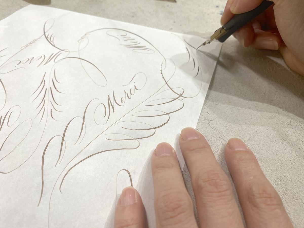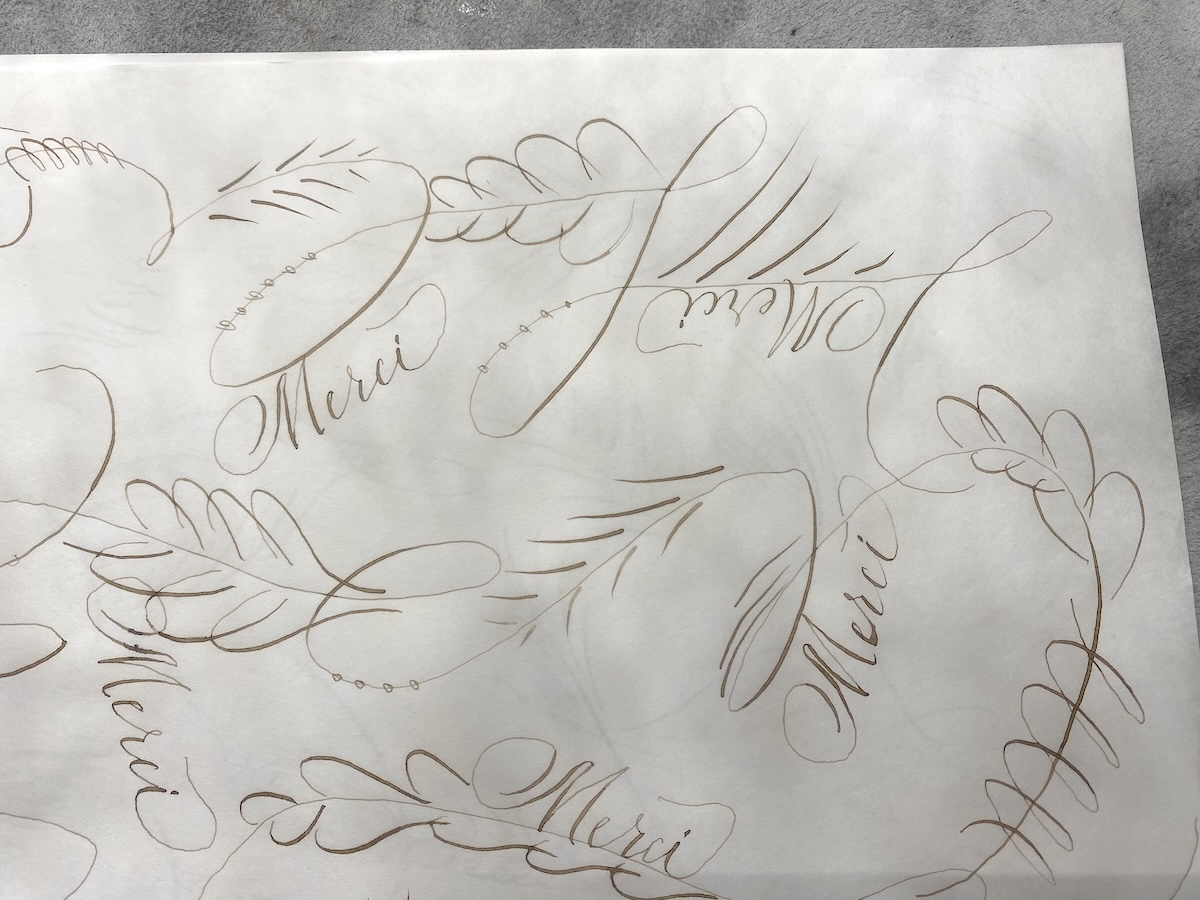 ベースの線が書けたら、ここからは自由!これまで学んできたさまざまなフローリッシュと「Merci」のフレーズを好きなところに書いて、自分好みのデザインにしていきます。プレゼントする相手のことを思いながら、書いていけばきっといい仕上がりになるはず。