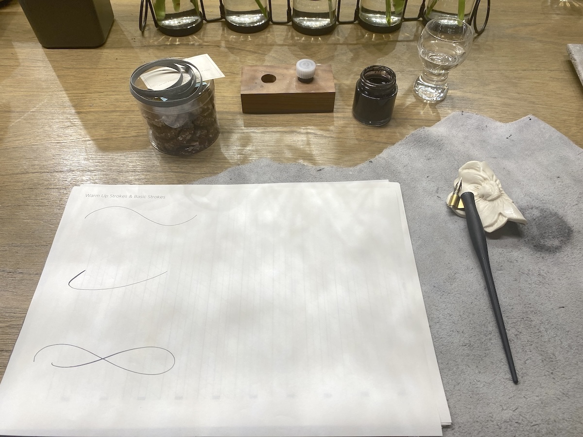 レッスンで使用するインクや材料はタイミングによって異なります。今回は、カリグラフィー専用のペン、インク2種(ブラック、クルミインク)、カリグラフィー用の練習紙、ラッピング用のシート、ペンの持ち方や書き方など基礎が載った教材でした。教材は持ち帰ることができるので家で復習もできます! カリグラフィーセットを持参するのもOKなので、お持ちの方はぜひマイセットで体験してみて。