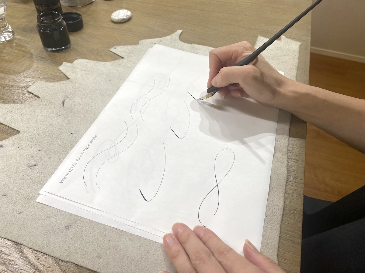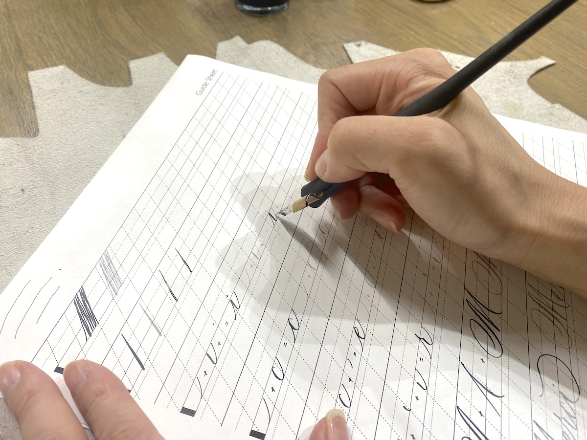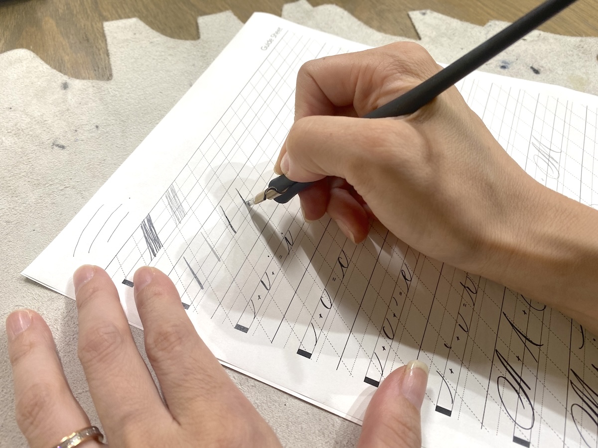 最初は黒いインクで、紙のガイド線に沿って書いていくのですが、カリグラフィー初心者の筆者はファーストステップから苦戦。苦手かも...と思いながらも見本とガイドをよくみて繰り返し練習をしていくと、だんだんコツをつかめてきました。難しいからこそ、綺麗な線を書けたときのうれしさがすごく大きいです。