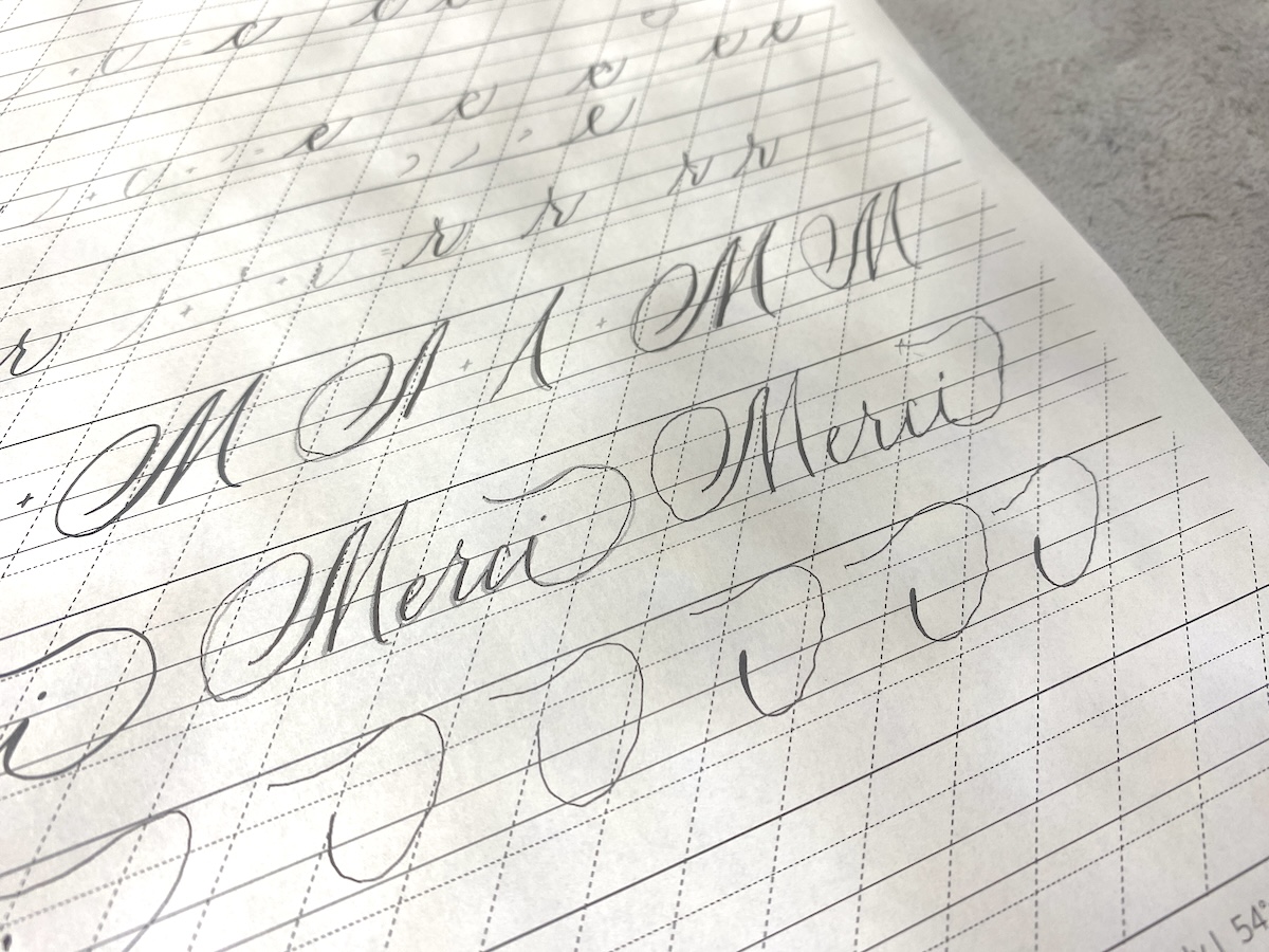 次はフレーズの練習をしていきます。「Merci(めるしー)」というフレーズが書けるように1文字ずつ何度も練習。フローリッシュよりも細かくて小さいからさらに難しそうと思いましたが、文字を1画ごとに認識すると意外と簡単!