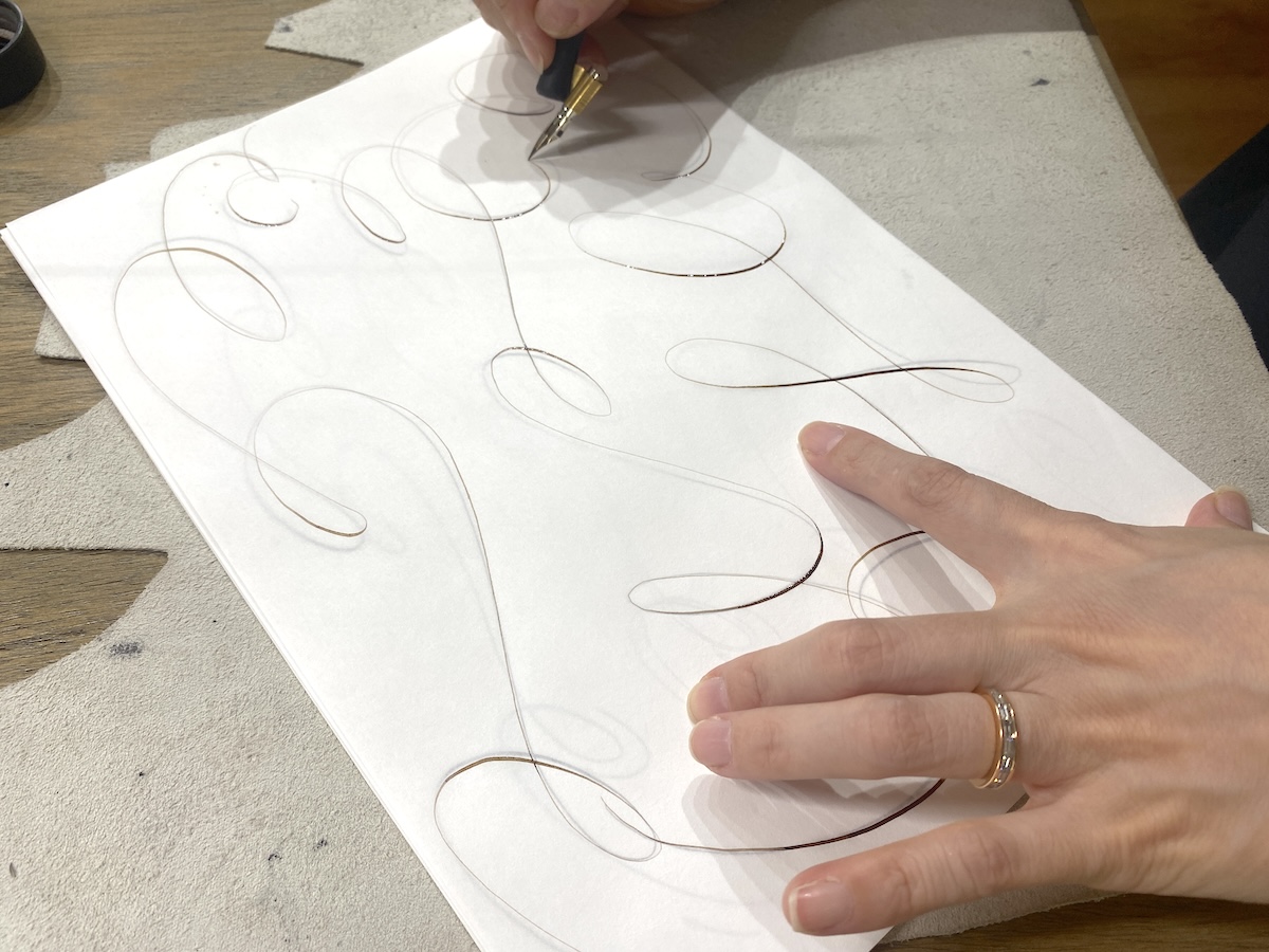 慣れてきたらフローリッシュにもチャレンジ。フローリッシュとは飾り線のことで、文字やデザインを華やかに見せてくれます。こちらもガイドに沿ってペンを動かしていきます。基本的には筆圧をほとんど入れずに動かして必要な部分だけ筆圧をかけること、ペン先の角度を一定に保ち続けることの2つがコツです。直線のときよりも難易度がグッとあがりましたが、挫けずにひたすら練習あるのみ!