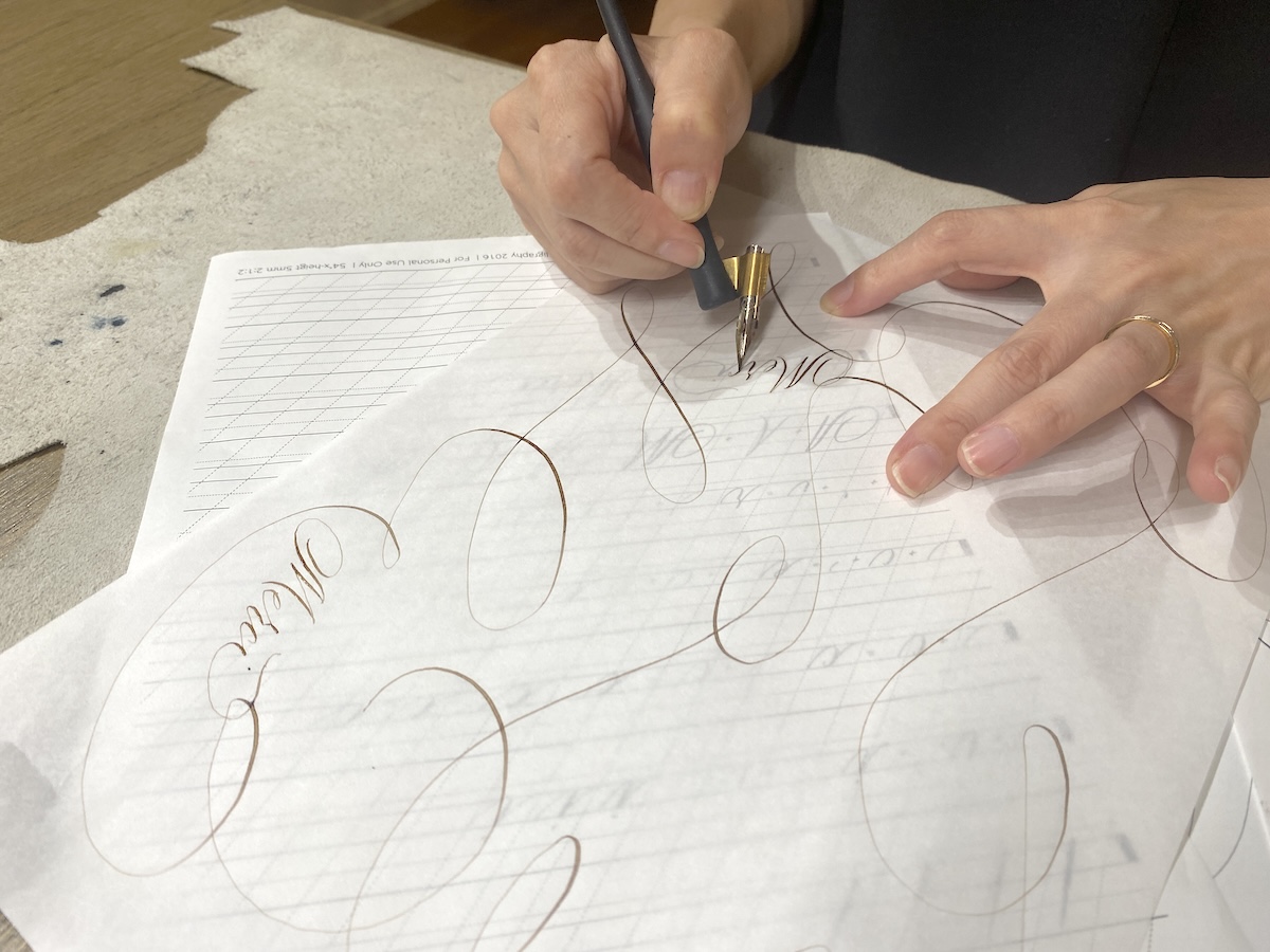 カリグラフィーにはさまざまな書体がありますが、主流になっているのはカッパープレート体。銅版画の製作が盛んだった17世紀に、薄い銅板にニードル(金属製のペン先)で文字を彫るために作られた書体と言われているそうです。
