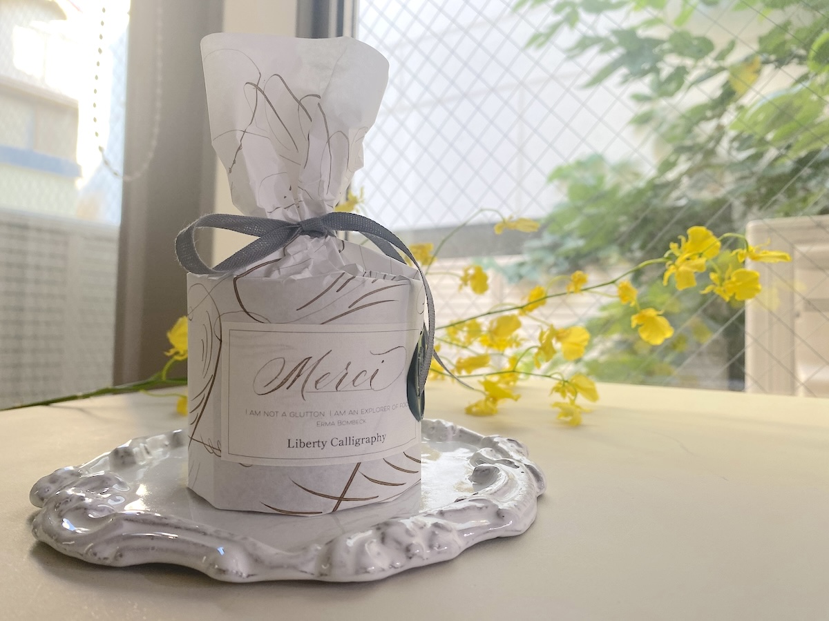 包装したときのことをイメージして、どの面をみても「Merci」が見えるようラッピングの至るところに書いてみました。習っていなくても思いつきで小さな丸を書いたり、ちょっとした絵を描いたりするのもオリジナリティが出てよさそう!