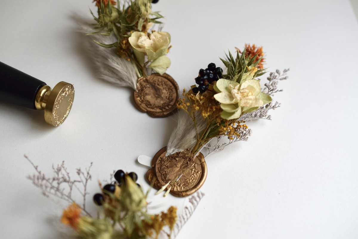 シールにフレーズを書いて正面に貼り、その上からシーリングスタンプを押します。スタンプの色や模様は、当日用意してあるもののなかから好きなものをセレクトできます。