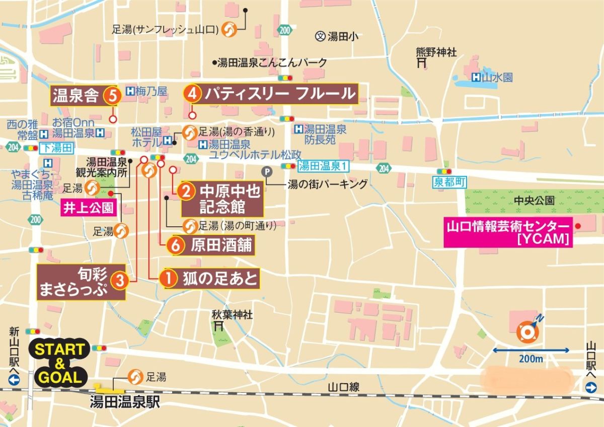 観光拠点「狐の足あと」を中心に、温泉宿や足湯施設、みどころが点在し、徒歩でまわれます。温泉を日帰り利用できる宿や、地元銘菓の山口外郎(やまぐちういろう)もチェック!