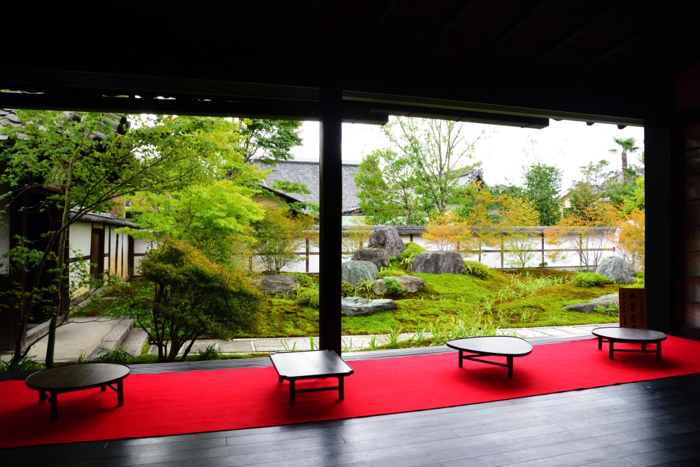 境内にはこの庭園を座って一望できるスペースが設けられています。静けさに包まれた境内でじっくりと時の流れを感じながら庭を眺めるのも素敵ですね。
