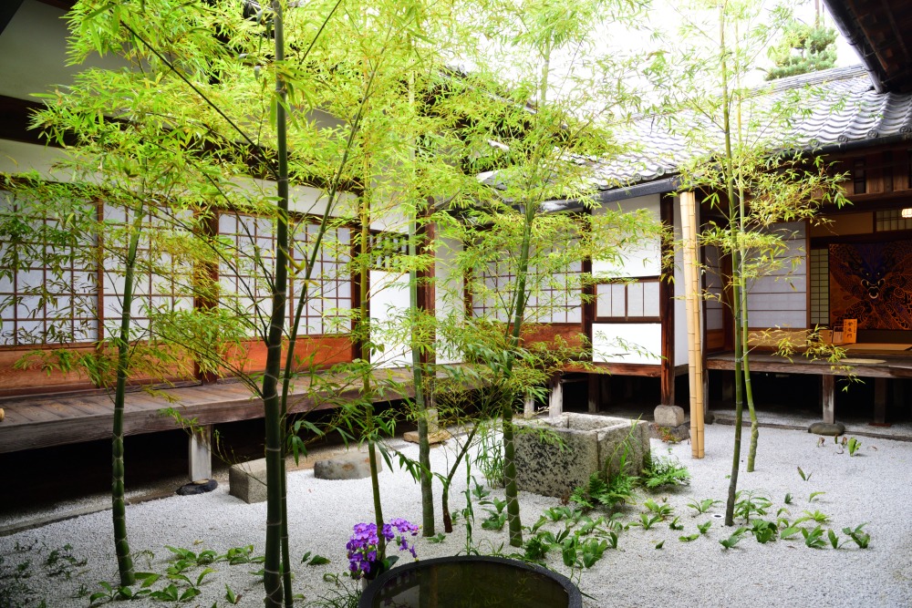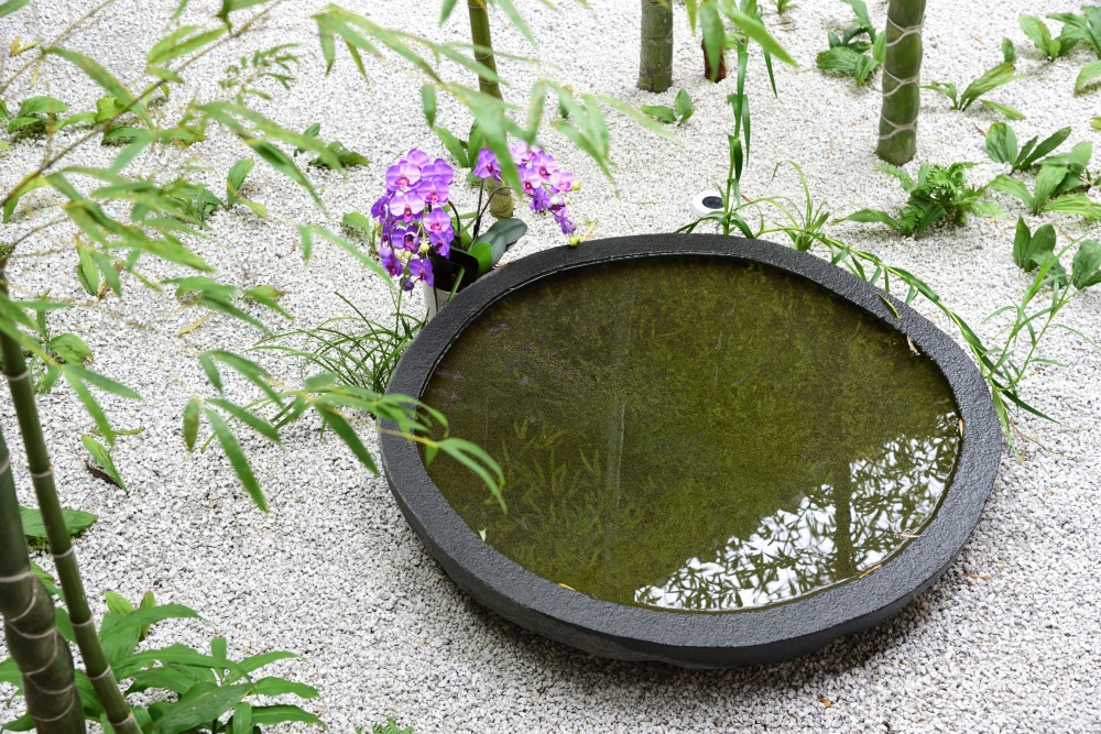 今回の改修で中庭も一新しました。白砂の庭園に竹が伸びる光景は、他の庭園とは違った趣です。こちらにも蘭の花が植えられ、晩春から初夏にかけて紫色の花々が咲き誇る美しい景色へと変わります。