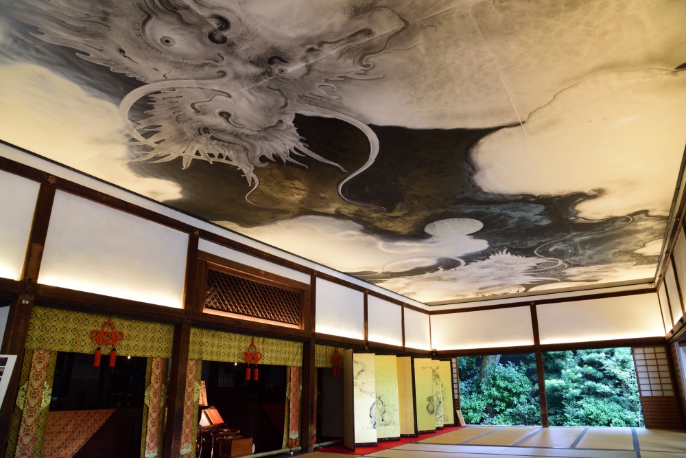 庭園と共に鑑賞したいのが、多くの現代アート作品です。本堂の天井に描かれているのは、世界的に活躍する中国人アーティスト・陳漫(ちぇんまん)さんが手がけた「白龍図」。東西13m、南北6mの巨大な空間に2頭の白龍がにらみをきかす光景は、思わずのけぞってしまうほどの圧倒的な存在感です。