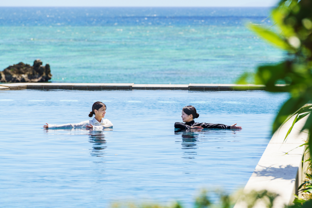 極上のスパ体験のほか、目の前の自然海岸で行う「浜ウォーキング」や、朝のストレッチ「浜かじ鍛錬深呼吸」などのプログラムにも参加。加温されたインフィニティプールでは、水中エクササイズと浮遊浴も体験でき、美しい景色を眺めながら身体をしっかりと動かすことができます。
