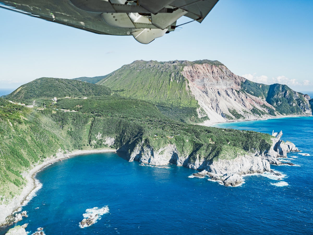 今回は調布飛行場から飛行機に乗って約45分で神津島へ。そのほか、竹芝客船ターミナルから夜行大型客船(約12時間)または高速ジェット船(約3時間45分)に乗ってもアクセスできます。飛行機は小さなプロペラ機でワクワク感満載! 上空からは東京の都会の景色や湘南エリア、そして伊豆諸島の島々と美しい海が見えて、あっという間に到着しました。