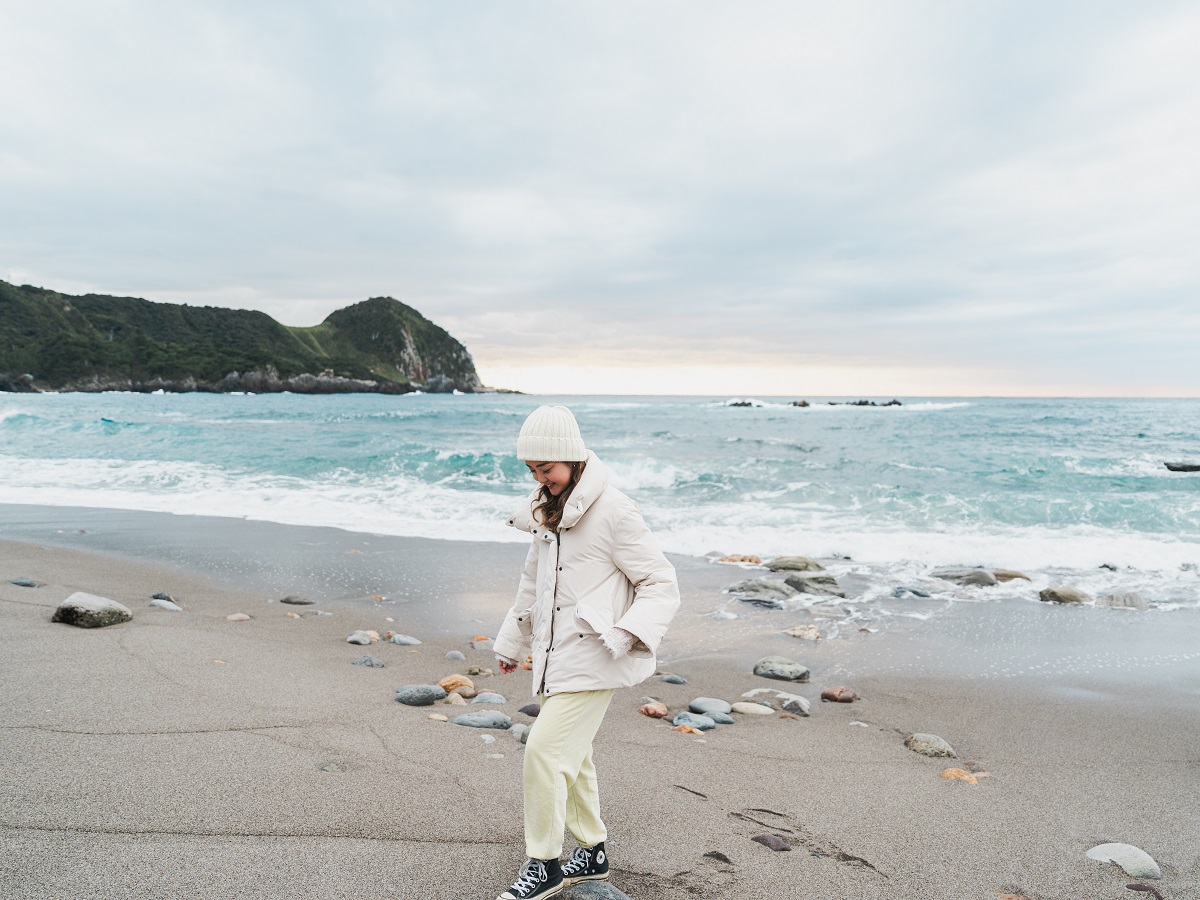 続いて訪れたのは「長浜海岸」。こちらは遊泳禁止エリアです。別名「五色浜(ごしきはま)」とよばれているそうで、青、赤、黄、黒、白といった色とりどりの石がかわいく、心踊りました。ですがここは神域なので、石を持ち帰ってはいけません。