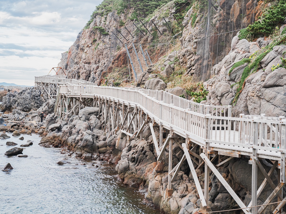 赤崎遊歩道には全長約500mの木造遊歩道が造られています。