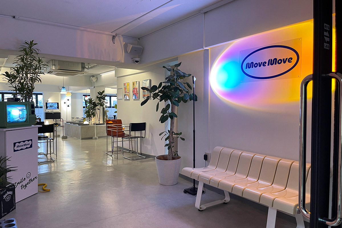 JR新大久保駅から徒歩約3分のビルの4階にあるカフェ「MoveMove」。ダウンライトのエントランスからは、おしゃれな雰囲気が漂います。
