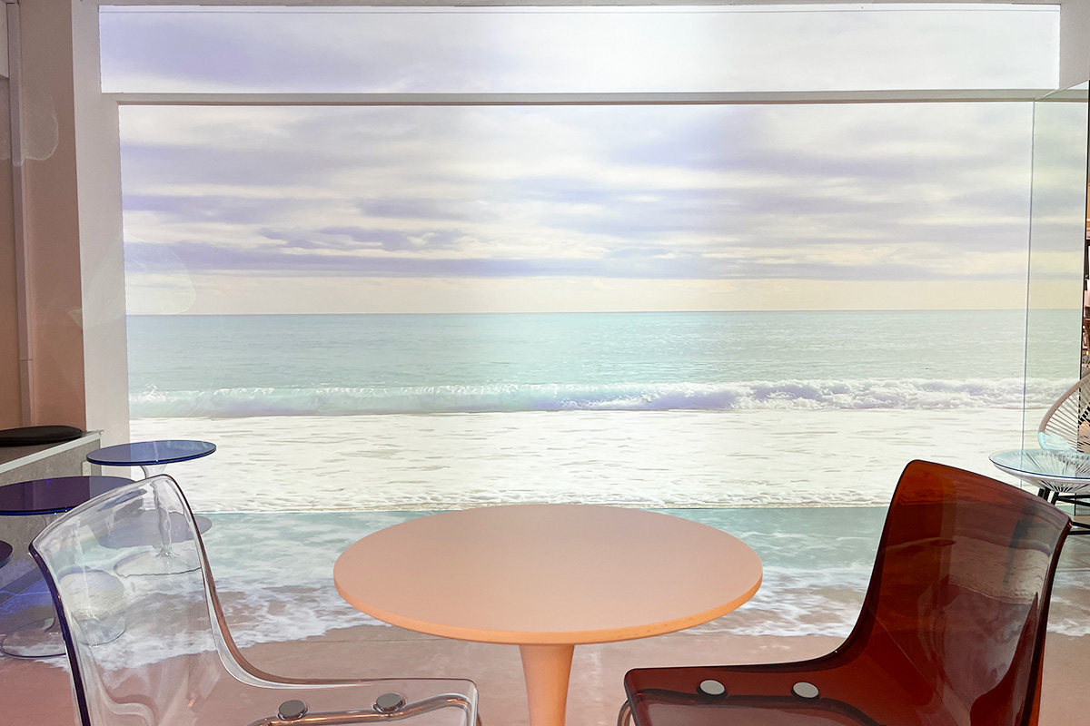 店内の奥に進むと、壁一面に海の映像が! 耳を澄ませると、「ザザン…」という波の音も聞こえてくるので、都会にいながら開放的な気分に。