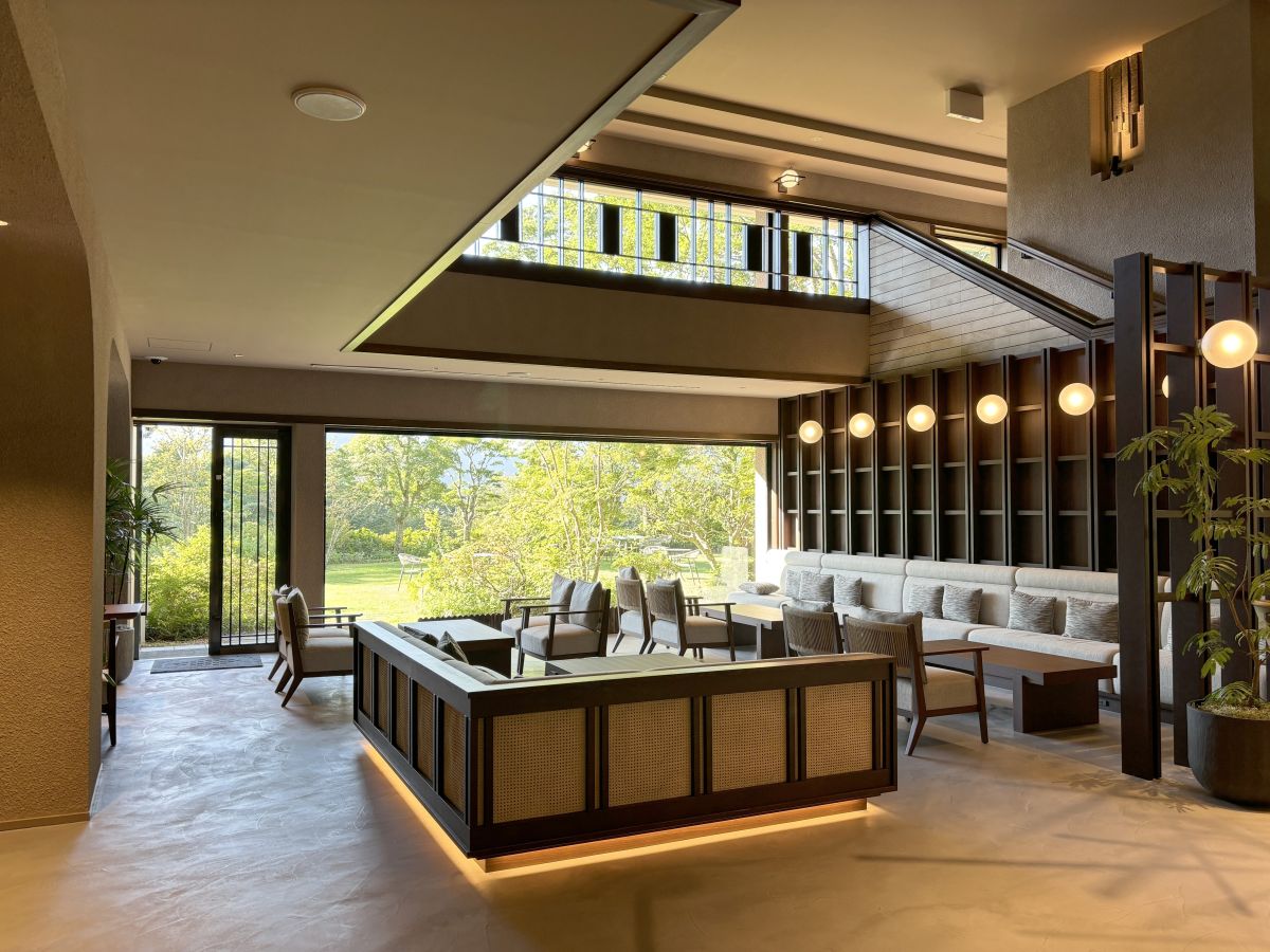 ロビーの奥にあるのは、ゆったりくつろげるラウンジスペース。大きな窓からは、美しい中庭や箱根の山々を一望できるので、チェックインまでの間、ラウンジでゆっくりくつろぐのもおすすめです。