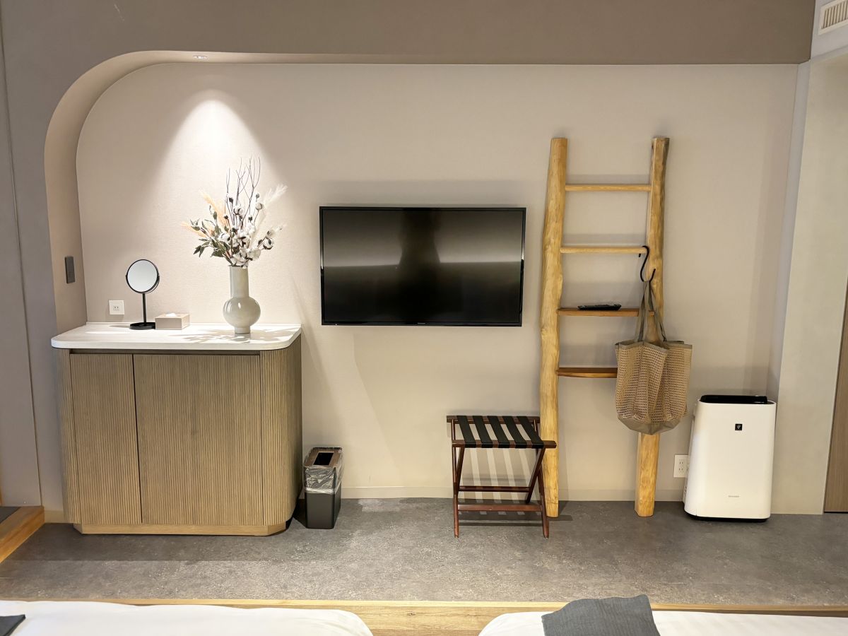 ベッドの向かいには、テレビや棚が置かれたスペースが。寝ながらテレビというなんともぜいたくな過ごし方ができちゃいます!