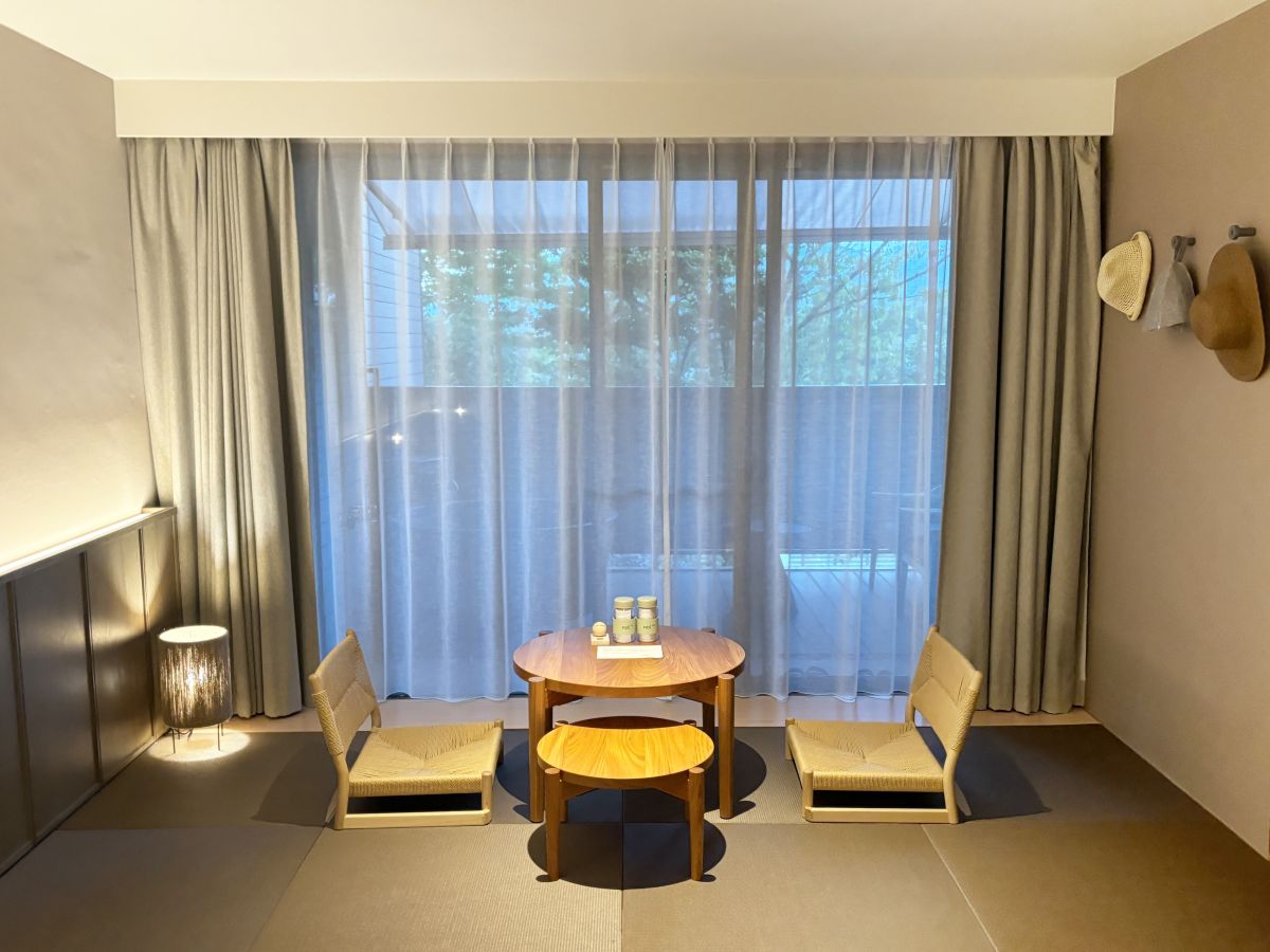 客室の奥にあるのは、畳にテーブル、座椅子が並べられたリビングスペース。畳の上でお茶をしたり、ゆったりお話をしたり、思い思いの休息時間を過ごせます。