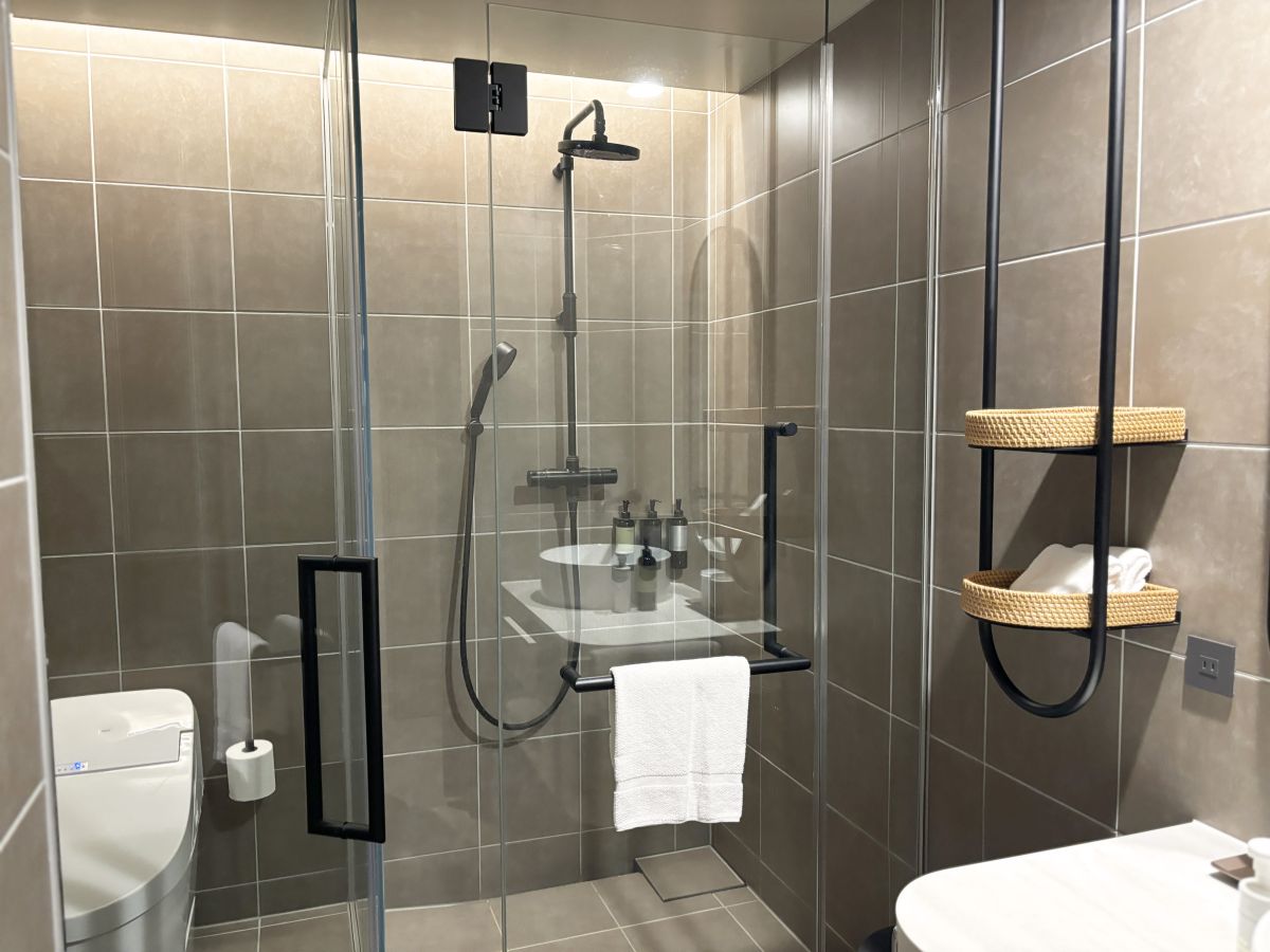 洗面所はシックなブラウンのタイル張り。ガラスでトイレとシャワールームが区切られているスタイリッシュな造りとなっています。
